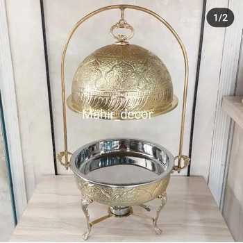 Hotel Restaurante Catering Nuevo diseño saudita Redondo SS Plato de frotamiento giratorio con Cubierta dorada 4 en 1 Juego de buffet Calentador de alimentos